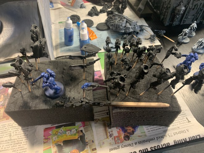 Prior to priming, I spend some time drilling small holes on the pieces using a dremel with the smallest bit, and then utilize toothpicks to mount the pieces onto foam. this will make it easier to prime the pieces, but also help with getting certain difficult parts later.